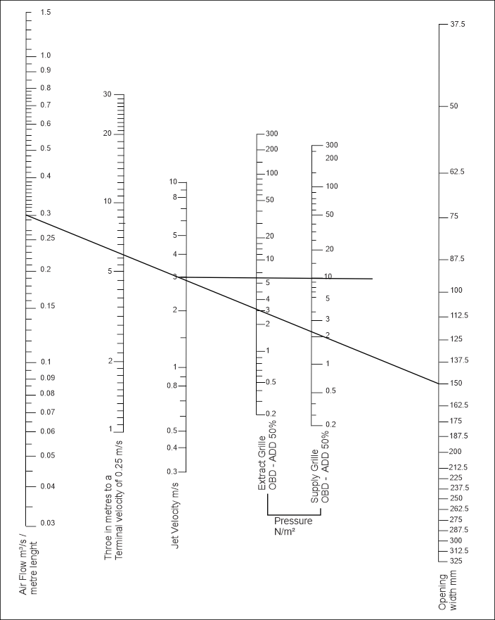 Type SGS - For 0,3 m3/s/metre and 6 metre throw use 150mm wide grille (duct width) |